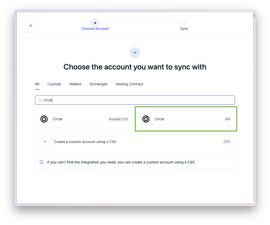 2. Search for "Circle" and choose the ["Circle: API" option](https://app.integraltreasury.xyz/accounts/add/circle_api)