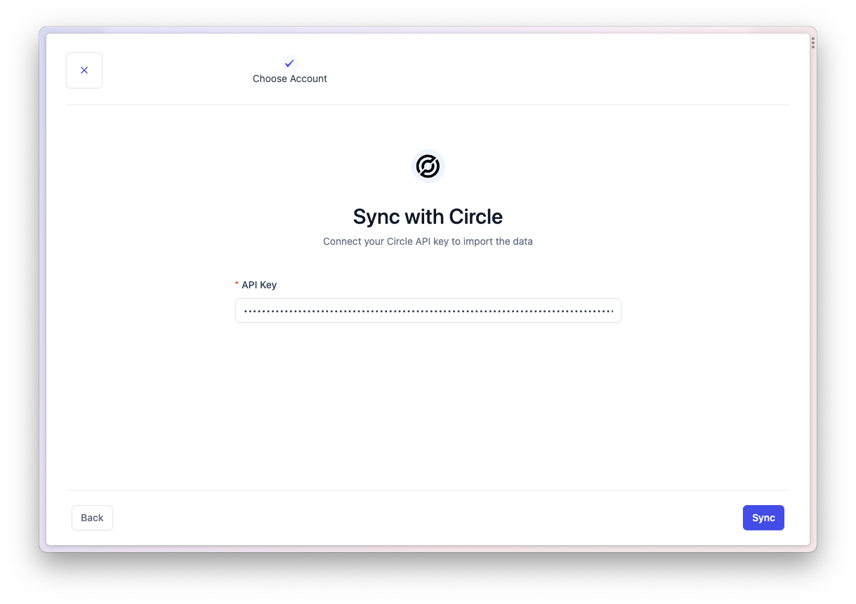 <figure><img src="https://3061199926-files.gitbook.io/~/files/v0/b/gitbook-x-prod.appspot.com/o/spaces%2Ft1fkaxq4yvhcAFiQKv7R%2Fuploads%2F555j4WKtjzxPPGqe1IEU%2FScreen%20Shot%202023-07-21%20at%204.10.40%20PM.png?alt=media&#x26;token=1941496b-b261-4a5c-ad25-bb26cc35391b" alt=""><figcaption><p>Paste in your Circle API key and click "Sync" to import your account transactions</p></figcaption></figure>