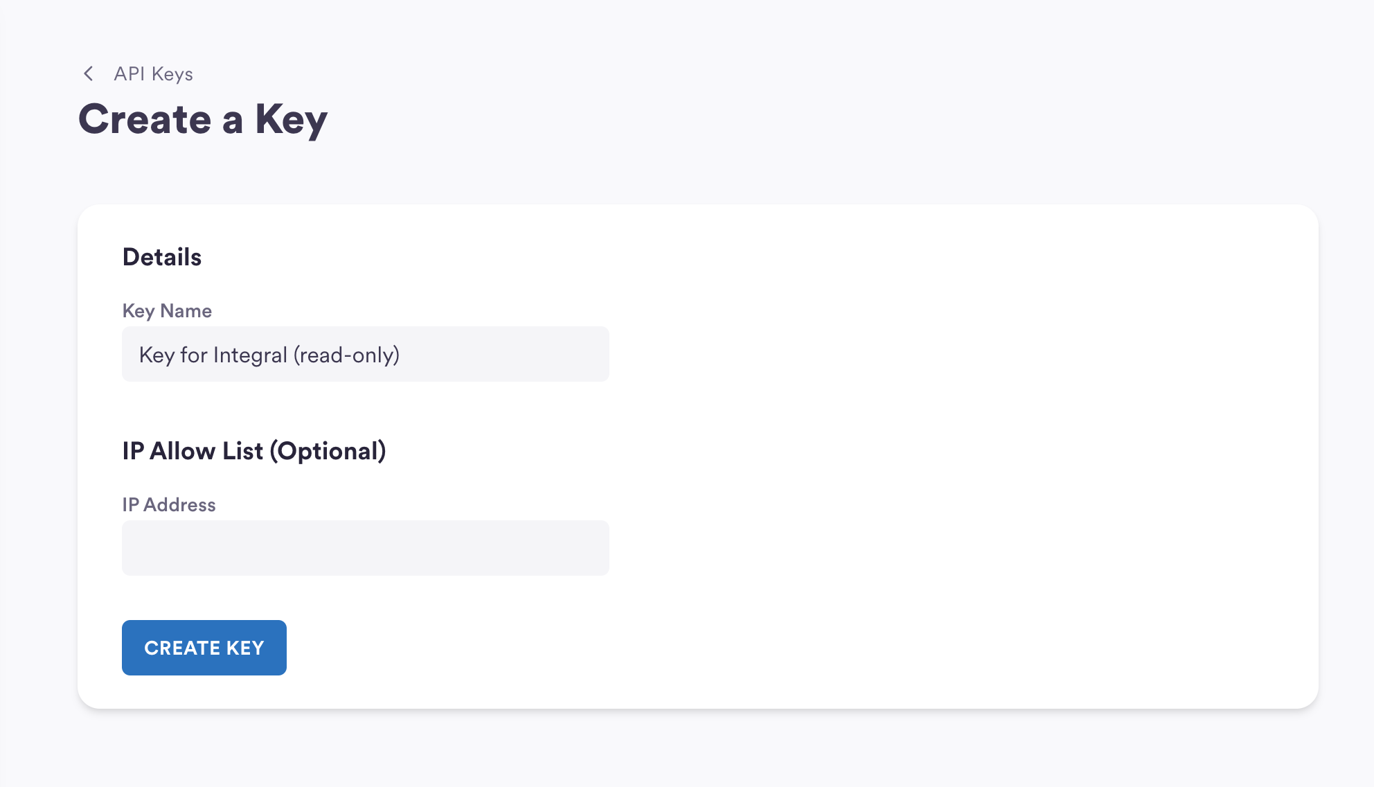 <figure><img src="https://3061199926-files.gitbook.io/~/files/v0/b/gitbook-x-prod.appspot.com/o/spaces%2Ft1fkaxq4yvhcAFiQKv7R%2Fuploads%2FZNaHG8IDrVlLgC2nehp1%2FScreen%20Shot%202023-07-11%20at%201.42.56%20PM.png?alt=media&#x26;token=92b80caa-6e0a-4081-b515-e94dc4a02fca" alt=""><figcaption><p>Give your API key a recognizable nickname, and leave the IP Allow List empty</p></figcaption></figure>