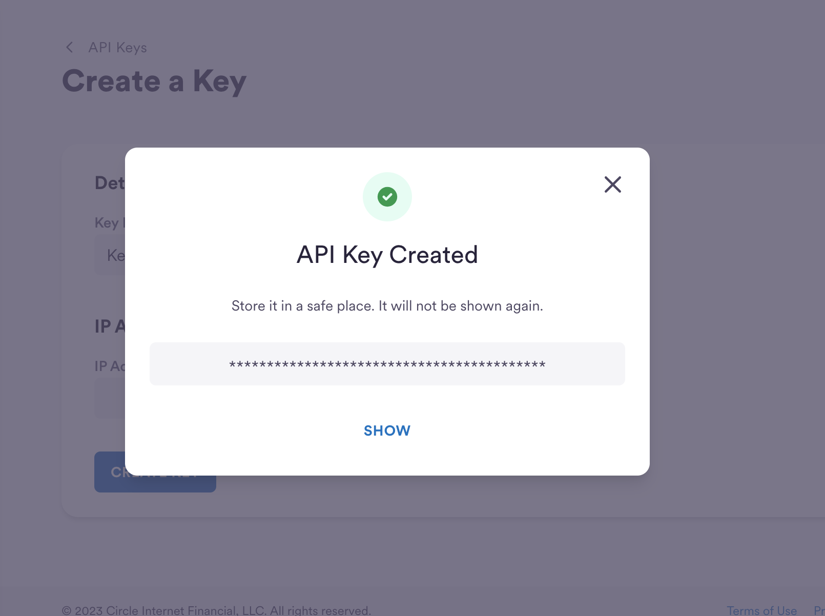 2. They will either send you the key, or you will be able to see it in your Circle account, under [Developer > API Keys](https://app.circle.com/developer/api-key)