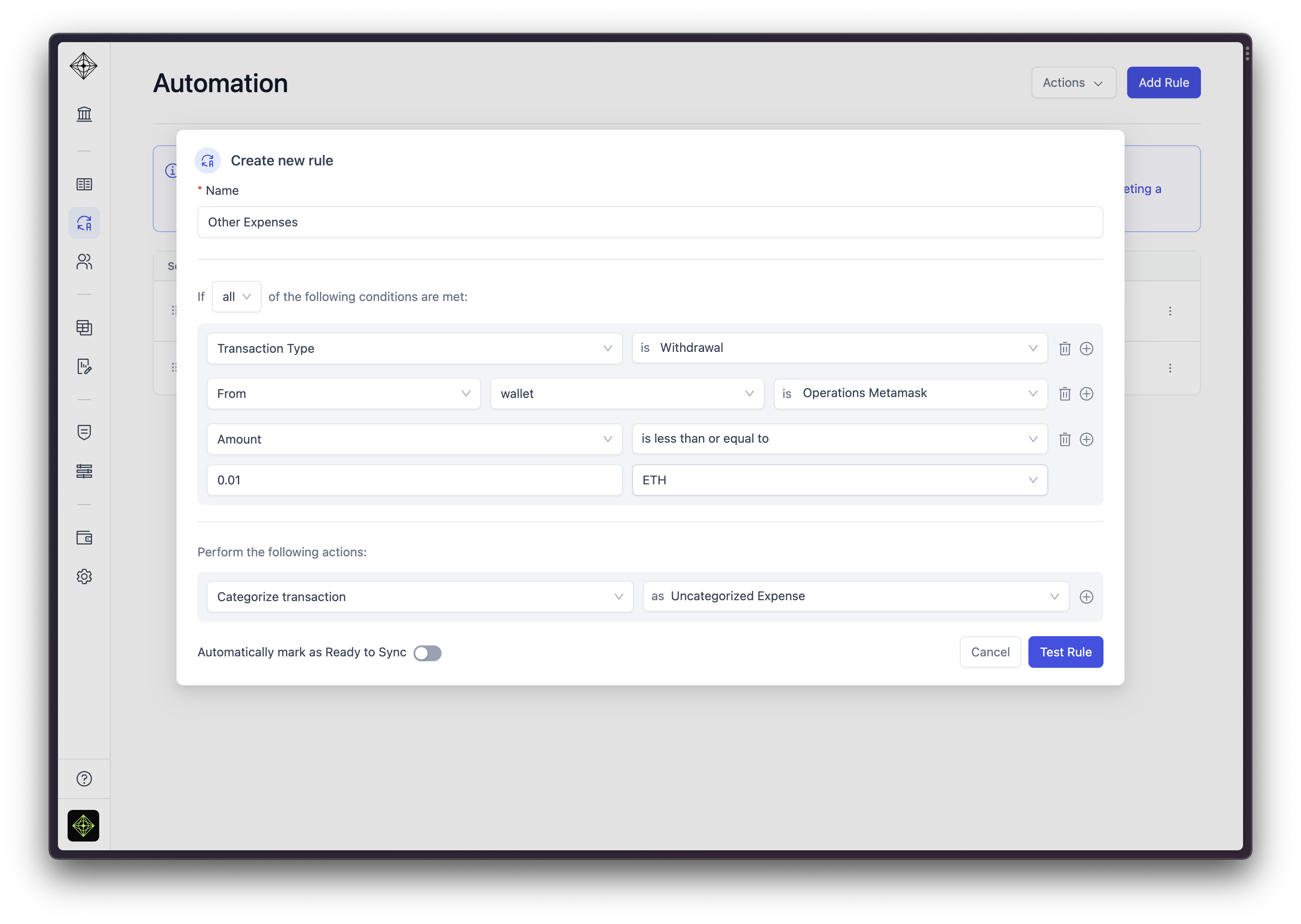 Create your first rule in Integral [here](https://app.integraltreasury.xyz/rules), or learn how in [Create a new Rule](https://www.notion.so/Rules-Automate-your-bookkeeping-ad30c7bb072741299d243e78f7bbe6db).