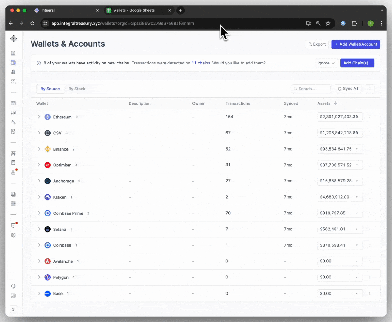 For detailed instructions on adding a specific chain or account type, see [Add Wallets & Accounts](https://integral-treasury.gitbook.io/integral-treasury/how-to-guides/add-wallets-and-accounts) under the How-To Guides section.