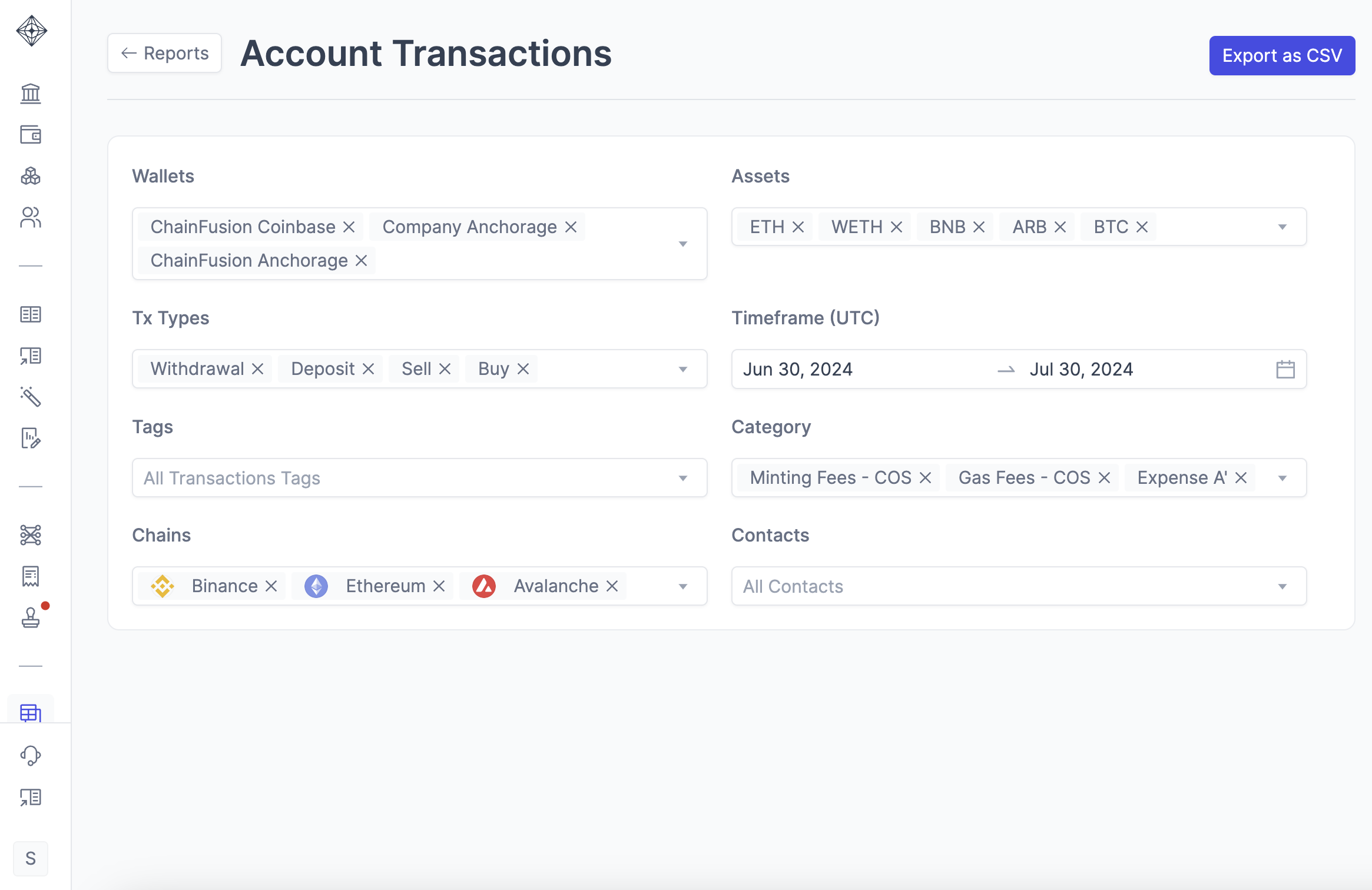 This report provides a detailed breakdown of every single transaction across all wallets, the token amounts, fiat amounts, realized gains/losses (where applicable), transaction hash, memo, from/to information, smart contract, and more.&#x20;