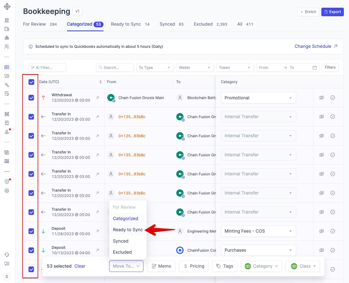 Once your transactions have been categorized (see them in [Bookkeeping](https://app.integraltreasury.xyz/accounting?category=categorized\&page=1)), you will need to mark them as *Ready to Sync*. This will move the transactions to the *Ready to Sync* tab in Bookkeeping.&#x20;