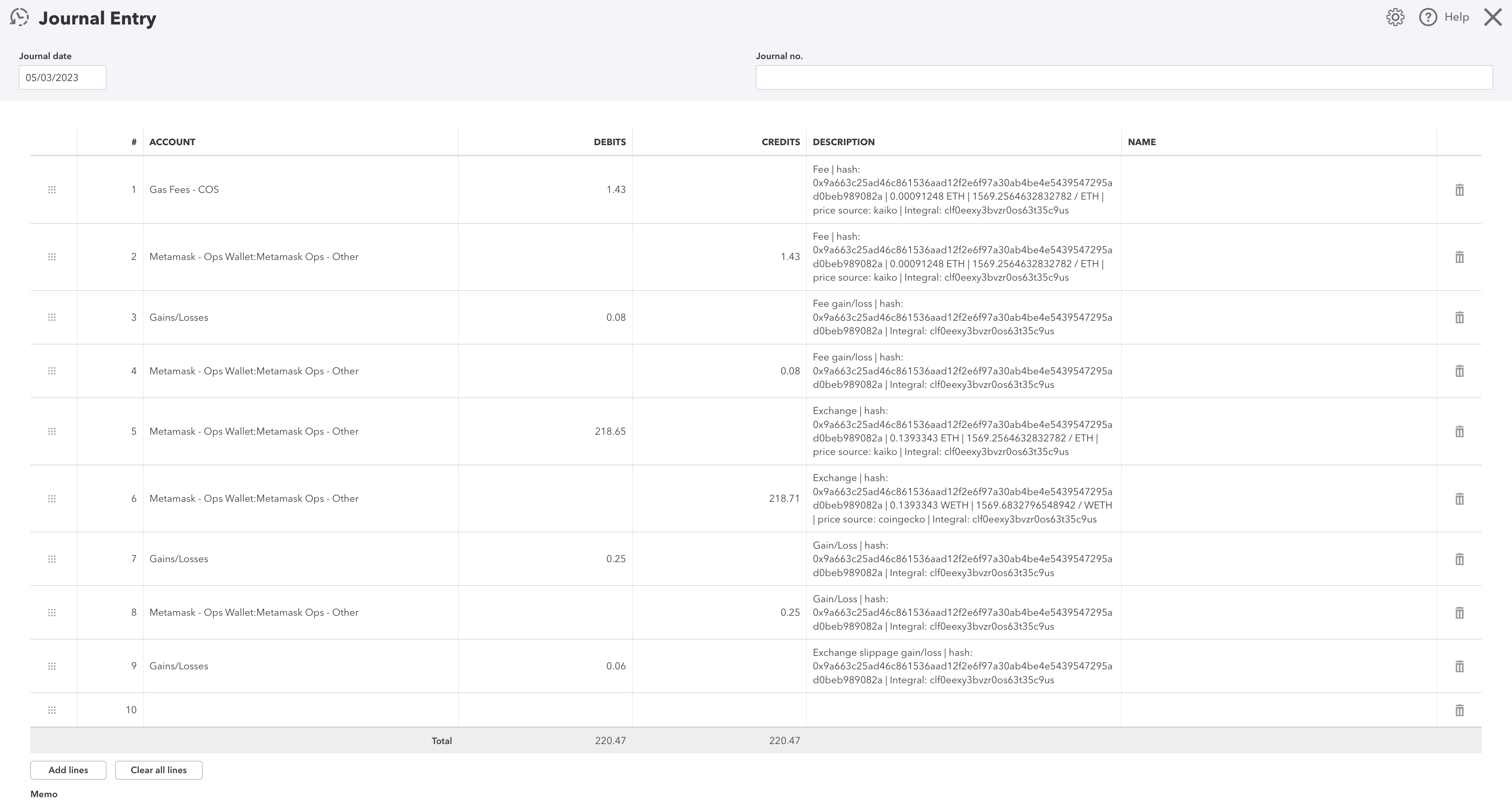 Below is an example of a token swap journal entry posted to Quickbooks. In the Journal Entry, there are individual lines for the: Swapped amounts, Fee, Gain/Loss on the amount, Gain/Loss on the fee, and slippage (where relevant).