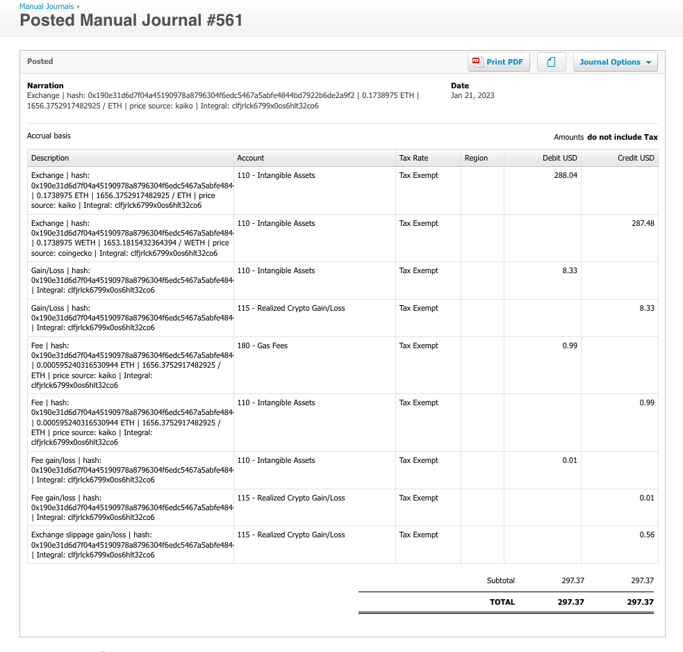 Below is an example of a token swap journal entry posted to Xero. In the Journal Entry, there are individual lines for the: Swapped amounts, Fee, Gain/Loss on the amount, Gain/Loss on the fee, and slippage (where relevant).